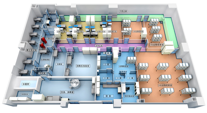 動物實驗室一般由飼養(yǎng)室、健康觀察室、隔離檢疫室、各種實驗室(外科手術、實驗處理解剖、術后管理、疾病診斷、治療、生理生化檢查、微生物檢疫、飼料營養(yǎng)分析和特殊飼料的調制室等),以及貯藏室、清潔準備室、洗滌消毒室、工作人員用房(包括辦公室、淋浴室、更衣室等)、走廊(清潔區(qū)和污染區(qū))、廢棄物處理設施、機房和變電所等組成。