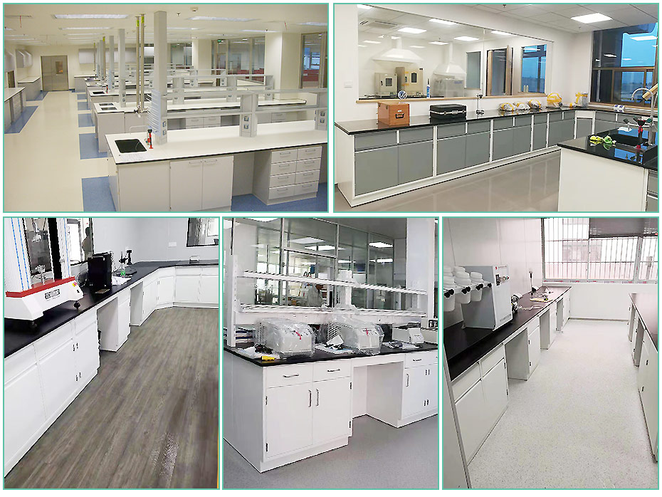 2、實驗室裝修設計內柜箱體-木質基材采用優質環保型E1比較中密度板,厚15mm,雙面粘壓三聚氰胺板,所有板材截面PVC熱熔膠防水封邊處理,配模具成型特制PVC暗拉手.安裝國標通用型CCC名牌產品電源控制系統.